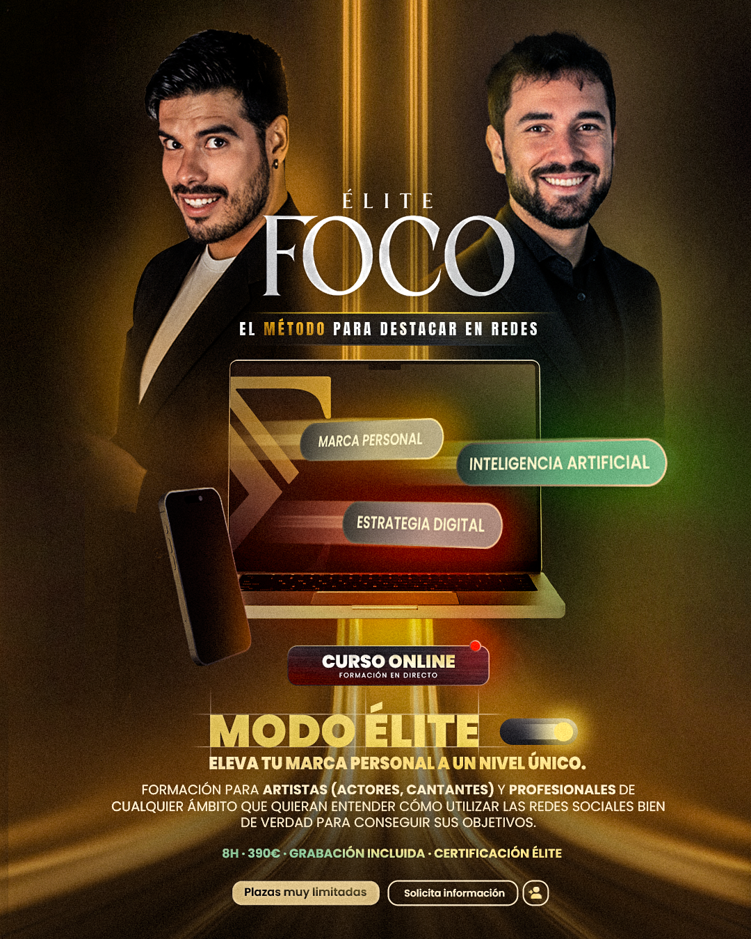 Élite Foco es un taller intensivo en directo diseñado para que dejes de improvisar en redes y empieces a construir una marca personal clara, profesional y reconocible. Vas a aprender a comunicar mejor, a crear contenido con estructura y criterio, y a usar la inteligencia artificial para ir más rápido, pero siempre con criterio y sin perder tu voz.